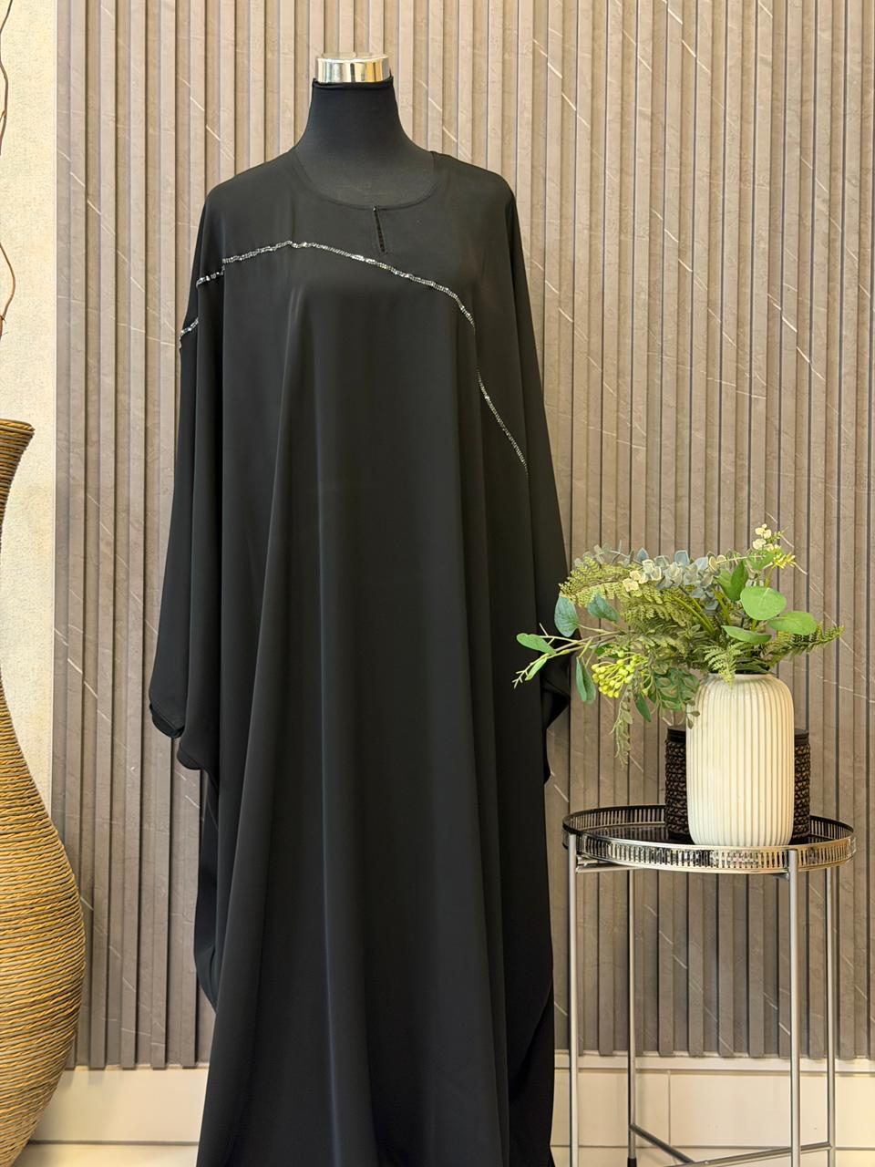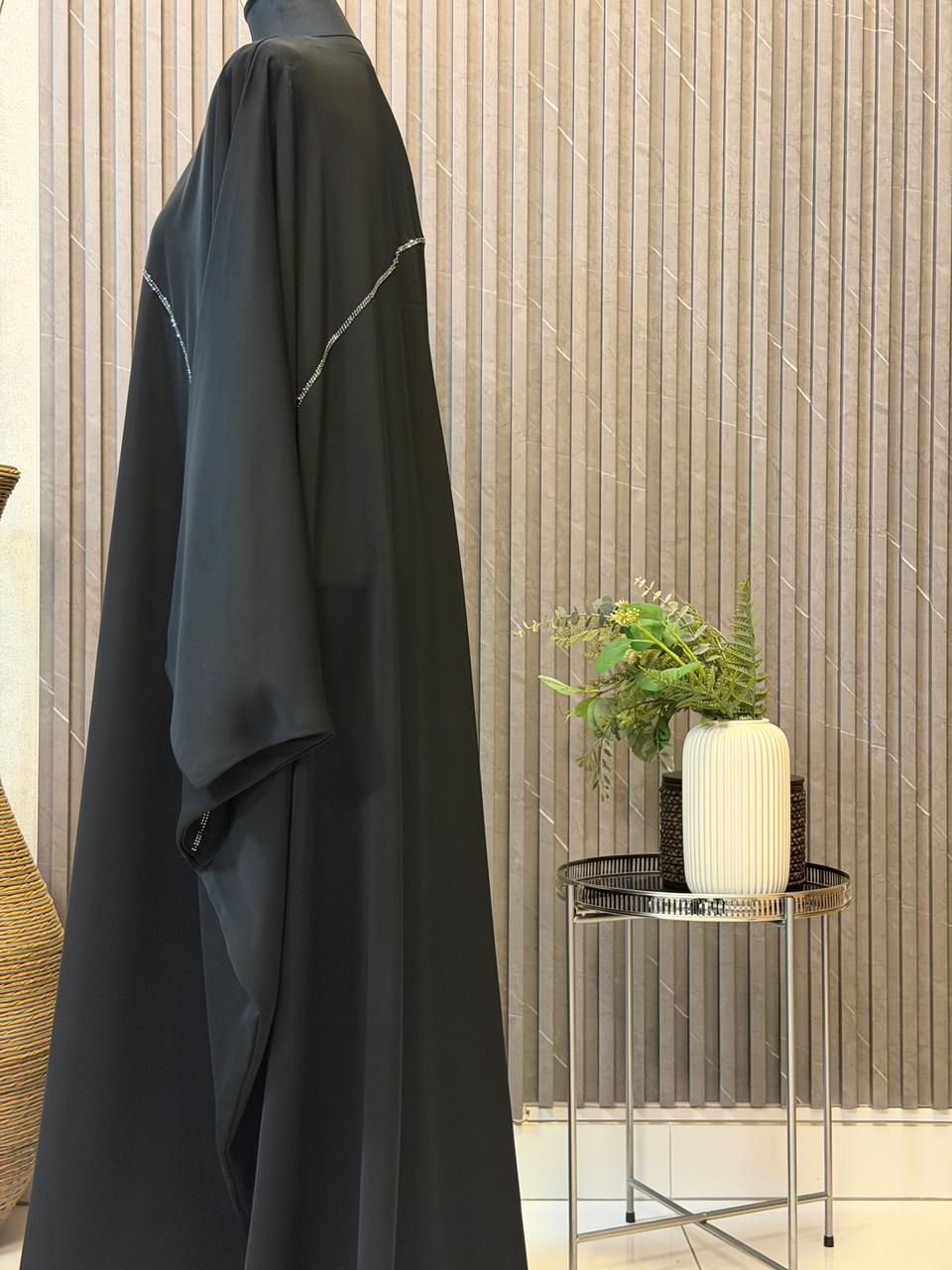 Plain Farasha with a two lined 100% guaranteed premium stonework all around the abaya and the scarf